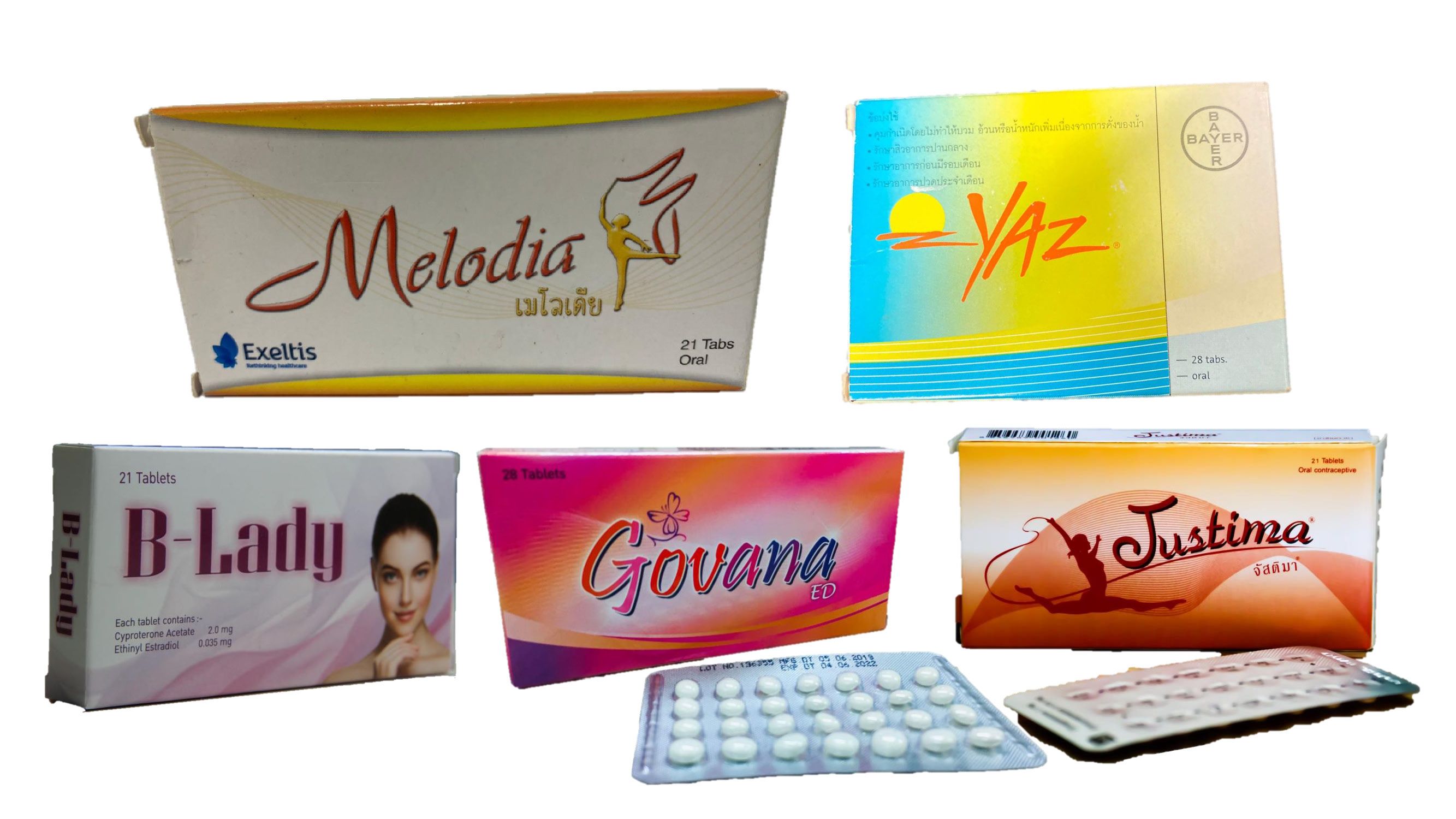 ตัวอย่าง ยาคุมกำเนิดชนิดเม็ดที่มีฮอร์โมนรวม เช่น Justima (จัสติมา), Yasmin (ยาสมิน), Yaz (ยาซ), B-Lady (บี-เลดี้ ) และ Govana (โกวานา)